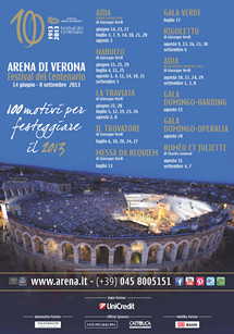 Per la stagione 2013, in programma dal 14 giugno all’8 settembre e dedicata al compositore Giuseppe Verdi in occasione del bicentenario della sua nascita, sei grandi opere verdiane e tre serate di Gala andranno in scena nel celebre anfiteatro scaligero.